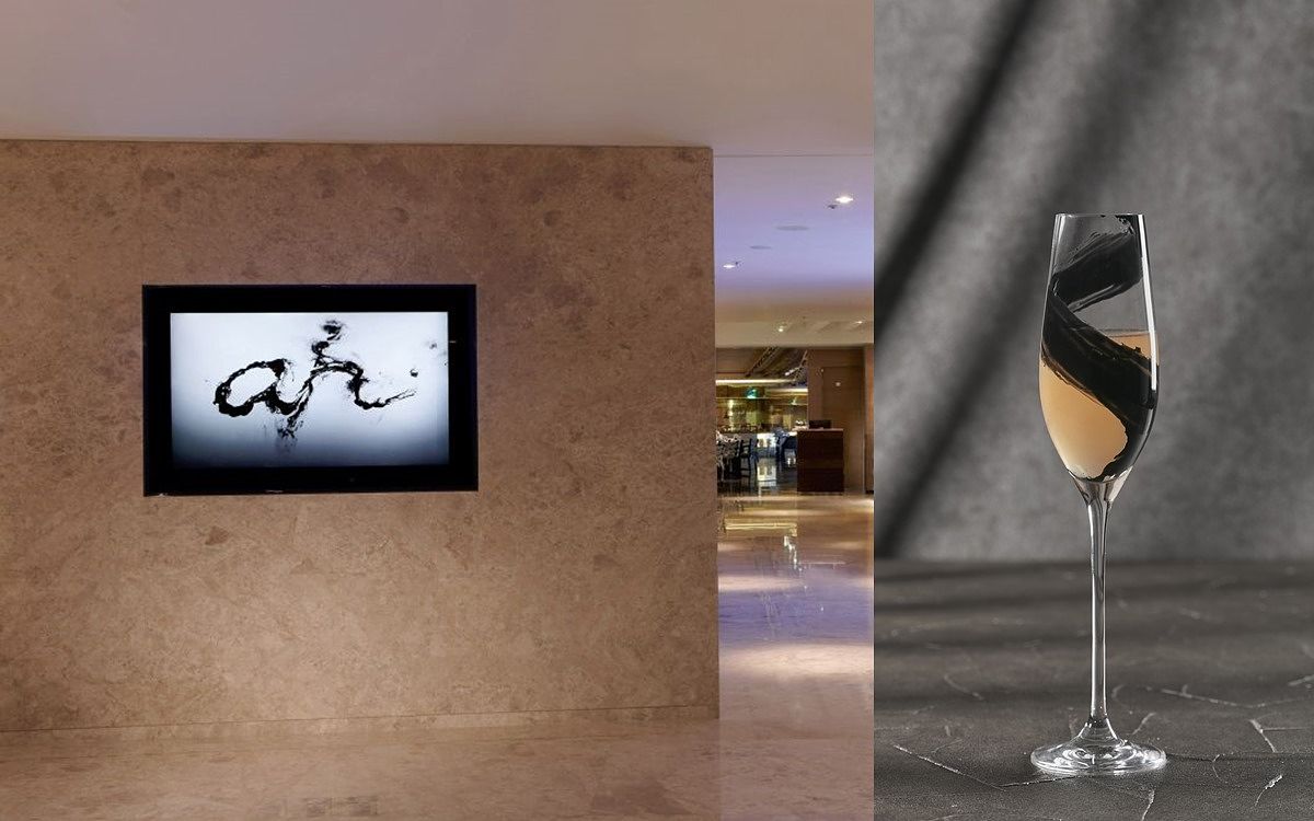 踏出六樓電梯,左側牆面播放著台灣藝術家蔡佳葳的《Ah!》錄像影片,同名調酒「Ah!」杯身上的豪邁毛筆線條,令人直覺聯想到該件作品。調酒師特別挑選優雅修長的香檳杯,隨性地拿起毛刷,一邊旋轉著杯身,一邊在杯子內層輕刷上一道竹炭粉果膠,展現影片中墨汁於水裡漂動的意象。綻放淡雅香氣的「Ah!」調酒以Bacardi蘭姆酒為基底,注入佛手柑、櫻桃風味等多款利口酒,輕啜一口,清新酸甜果韻躍上舌尖,尾韻更捎來一絲葡萄柚汁的細柔苦韻,畫龍點睛般驚亮味蕾。
