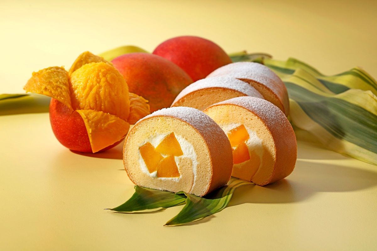 使用當季愛文芒果新鮮現切現捲,外層是湯種蛋糕體,內餡是以日本中澤乳霜打發後,再鋪上三排滿滿的愛文芒果。