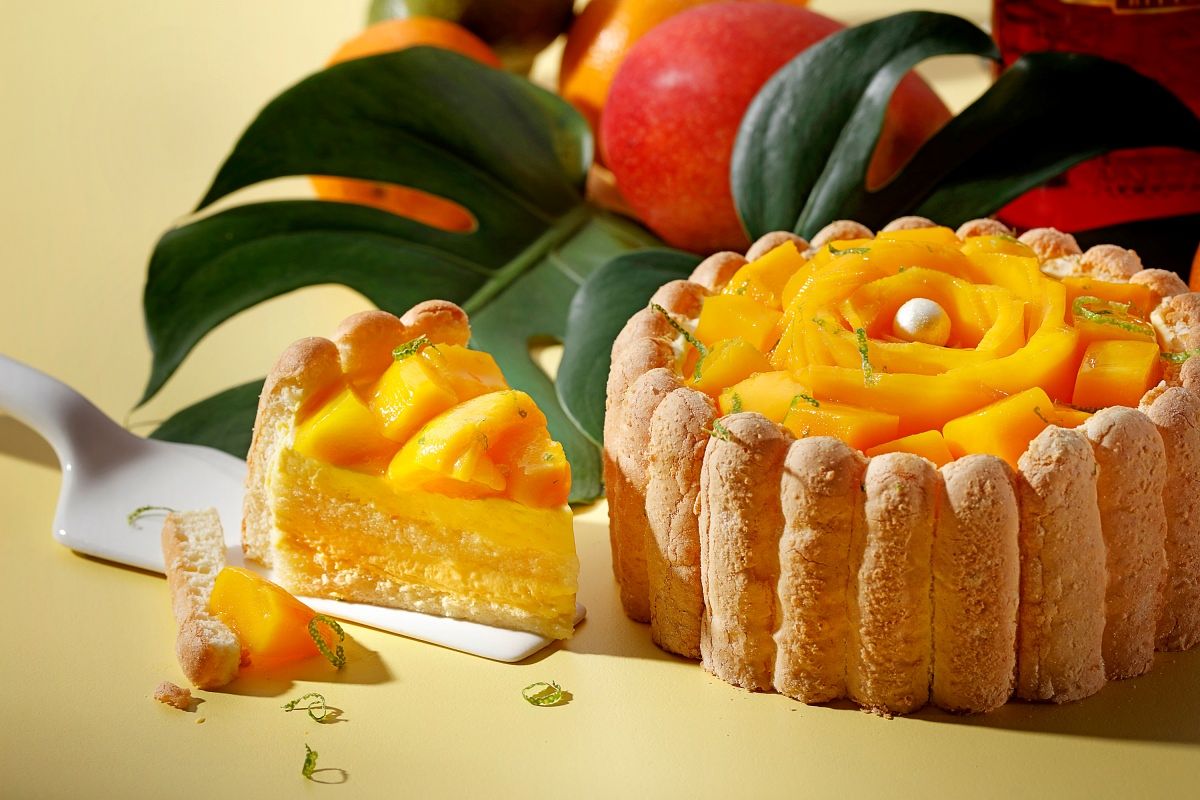 內餡以兩層戚風蛋糕包夾滑順的芒果柳橙慕斯,並以義大利知名利口酒—金巴利酒增香;外層以蓬鬆酥香的手指餅乾圍邊,營造出鮮甜宜人的豐富口感,再以新鮮愛文芒果鋪滿蛋糕表面。