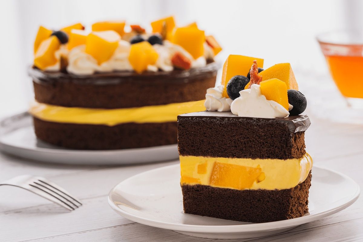 以 70% 比利時高級苦甜巧克力鬆軟湯種戚風蛋糕體為基底,搭配新鮮百香果酸甜夾餡,每口都能吃到礦石般大小的新鮮在地芒果,蛋糕頂部抹上濃醇生巧克力醬,綴以紅心芭樂及新鮮藍莓,無論是口感或是視覺上都更增添夏日繽紛氣息!