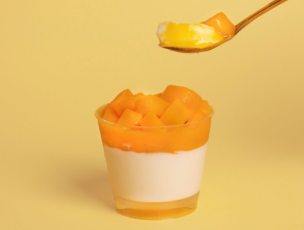 順口鮮濃奶酪搭配大粒芒果丁,每口都可以吃到飽滿的金黃色芒果。