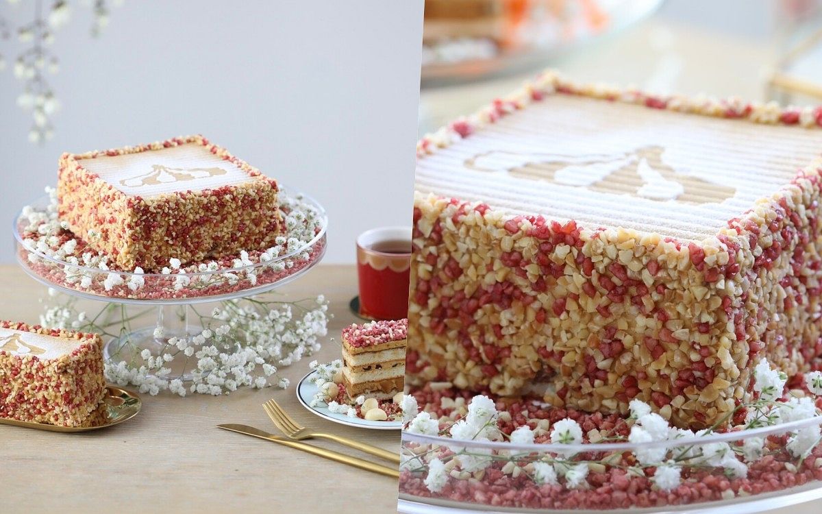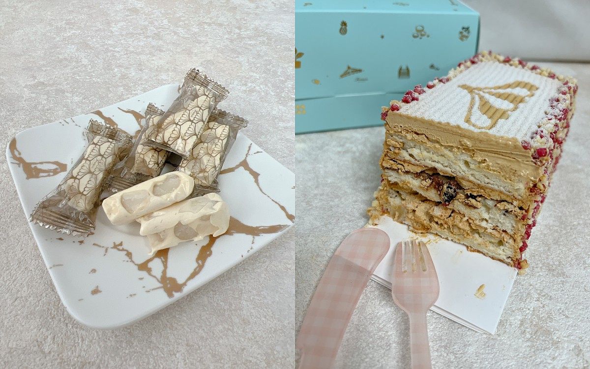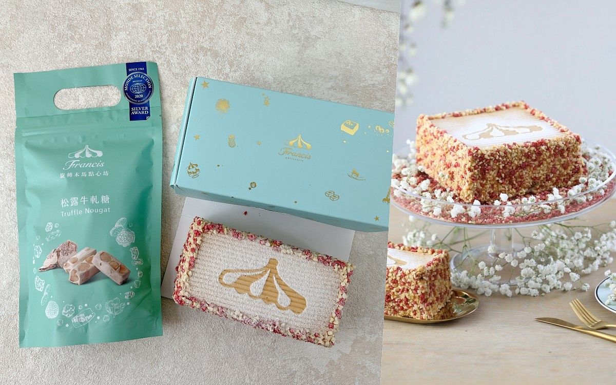 母親節蛋糕評選冠軍,蛋糕體以蛋白及杏仁粉製作,夾層為使用比利時進口榛果醬熬煮而成的榛果焦糖奶油餡,搭配鹽烤夏威夷豆、酒漬蔓越莓及葡萄乾,特殊的冰凍吃法,整體口感層次豐富,加上吸睛的造型,絕對是最完美的蛋糕,一吃就讓人念念不忘!而牛軋糖散發出濃郁的白松露香氣,夏威夷豆香中帶脆,口感Q彈柔潤而不黏牙,鹹甜交錯的好滋味。經典熱銷組合直接帶回家!