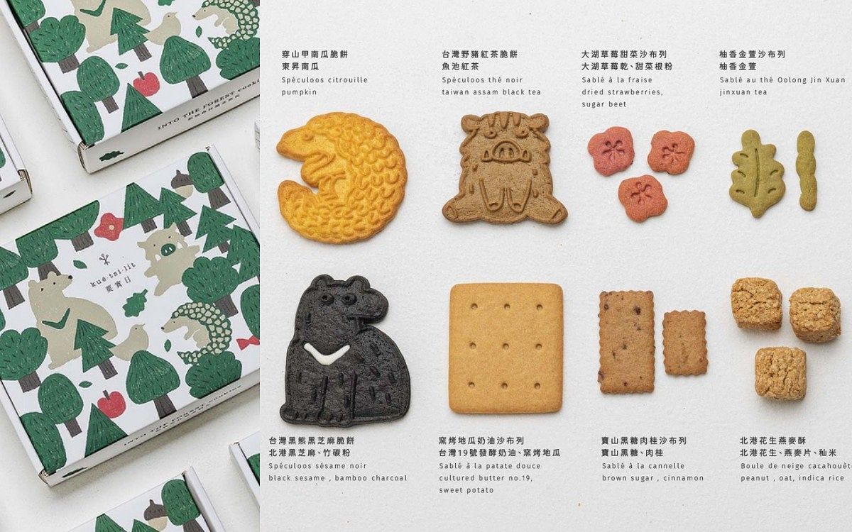 內容物:台灣黑熊黑芝麻脆餅、穿山甲南瓜脆餅、台灣野豬紅茶脆餅、窯烤地瓜奶油沙布列、大湖草莓甜菜沙布列、寶山黑糖肉桂沙布列、柚香金萱沙布列、北港花生燕麥酥、薄荷柚子檸檬沙布列、紅薏仁焦糖榛果