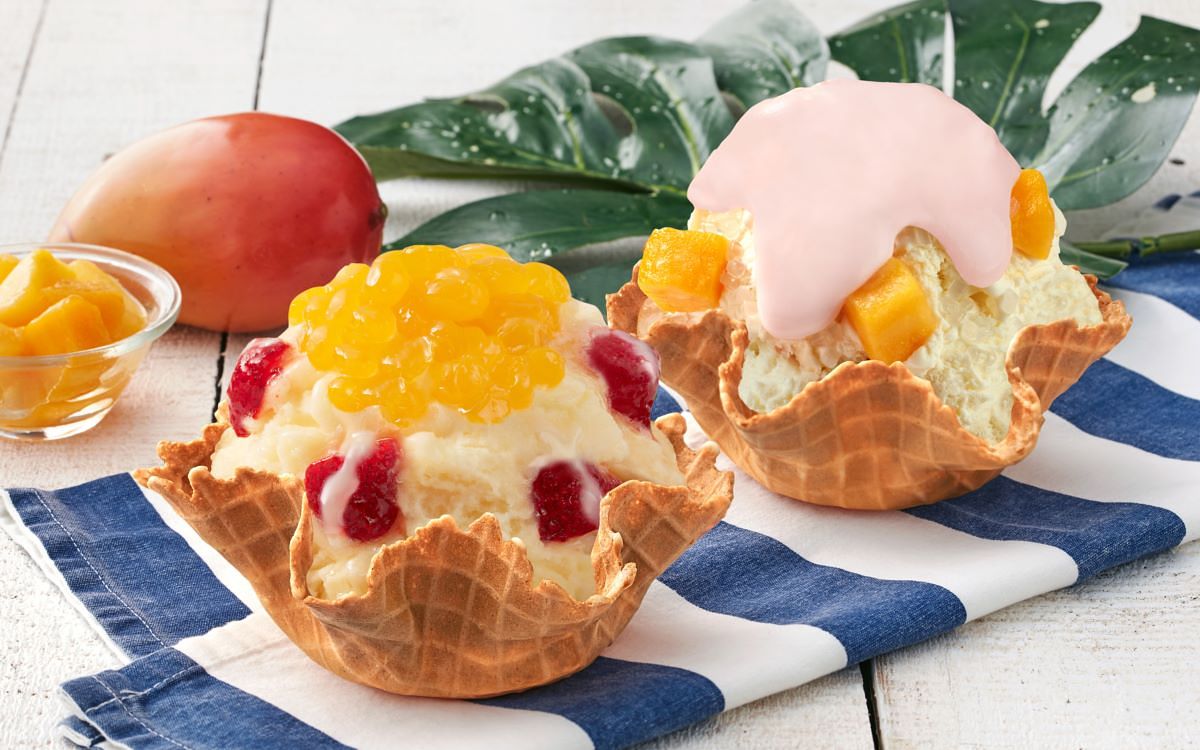 『芒果之煉』超芒人氣必吃款!愛文芒果果泥製成雪貝,再拌入草莓增加酸甜口感,撒上富有咬感的芒果風味晶球,每一口都是「芒味交織」鮮甜美味,最後淋上濃郁可口,鮮乳坊特A級鮮乳製作而成的鮮乳煉乳,使層次更加豐富!『楊枝美莓』去年一推出就受到熱愛的楊枝甘露冰淇淋,靈感來自香港甜品的楊枝甘露,今年強勢2.0回歸!拌入鮮甜愛文芒果、咬感十足QQ晶球,最後再放上粉嫩的草莓奶蓋,這個夏天層次最豐富的冰品慶典!