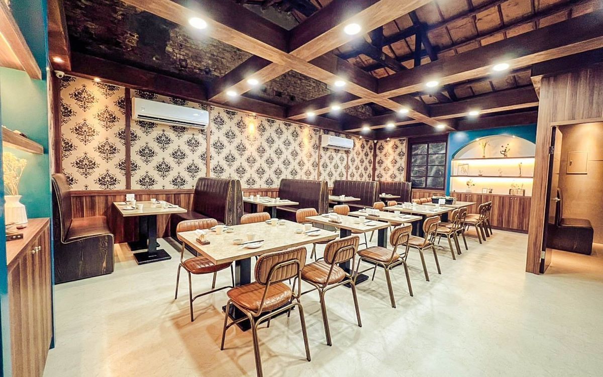 古北饕旗艦店的店門口及一樓以潮流簡約工業風為設計主軸,讓饕客們可以感受像在咖啡廳吃中式料理的輕鬆氛圍,同時欣賞多位師傅在廚房中展現猶如魔法般的手藝,佳餚上桌更加美味。走上二樓,彷彿穿越時空,來到充滿歷史感的復古氛圍,主理人所謂的別有洞天就是在裝修時打掉原有的天花板,才發現二樓天花板裡竟然藏著具有歷史感的木造三角屋頂,決定讓它的美重新亮相,特別結合復古感裝潢,並以一大獨立包廂可接待12位貴賓、四個開放式沙發區各可容納 4至6位饕客等寬闊的座位規劃,滿足饕客們不同的歡聚用餐需求,疫情防疫期間也能安心的在店內用餐。