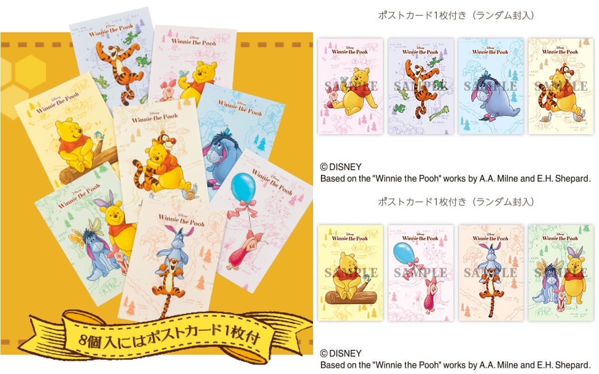 蜂蜜蛋糕分為4入裝與8入裝兩款,8入裝的包裝另外附贈小熊維尼圖案的明信片,共有8款設計隨機贈送!
