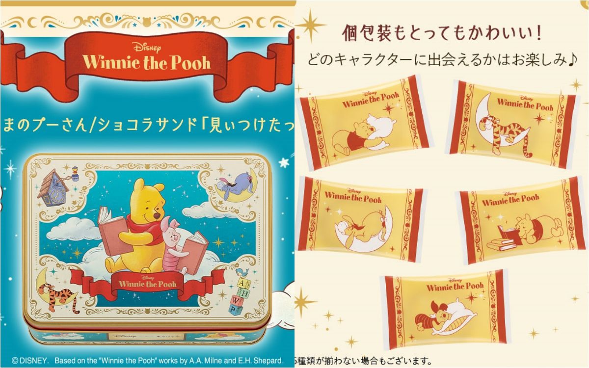 另外一款超可愛商品是小熊維尼的「白巧克力三明治餅乾」,復古的鐵盒包裝,裡面共有28個包裝餅乾,5款不同設計的包裝袋,餅乾上隨機印製3款維尼不同表情的圖案,也是一款要攻陷維尼粉絲的限定商品!
