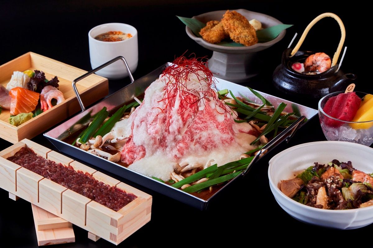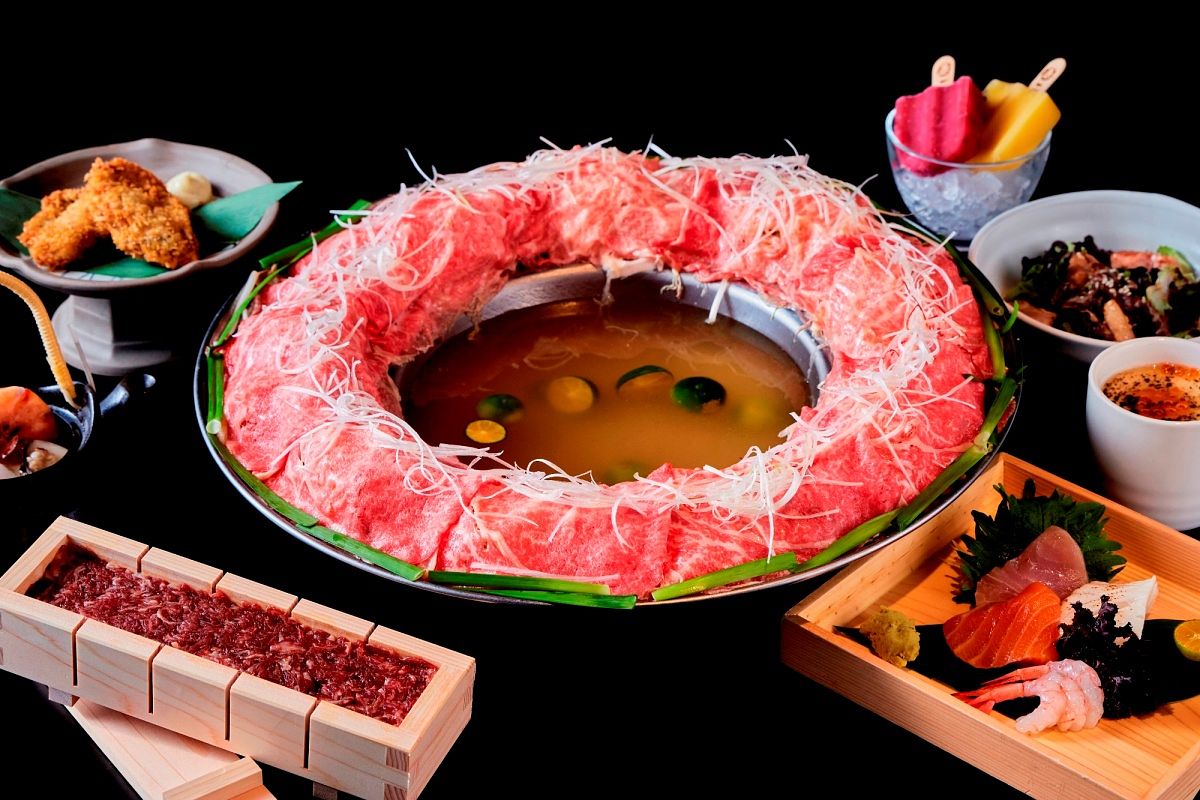 除鍋物主餐外,附餐含生魚片盛合、松露鮭魚卵茶碗蒸、廣島炸牡蠣、生牛肉炙燒押壽司、肉沙拉、土瓶蒸、春一枝冰棒。另有生牛肉吧噗、雲丹痛風炸牛排等造型浮誇吸睛的單點料理。