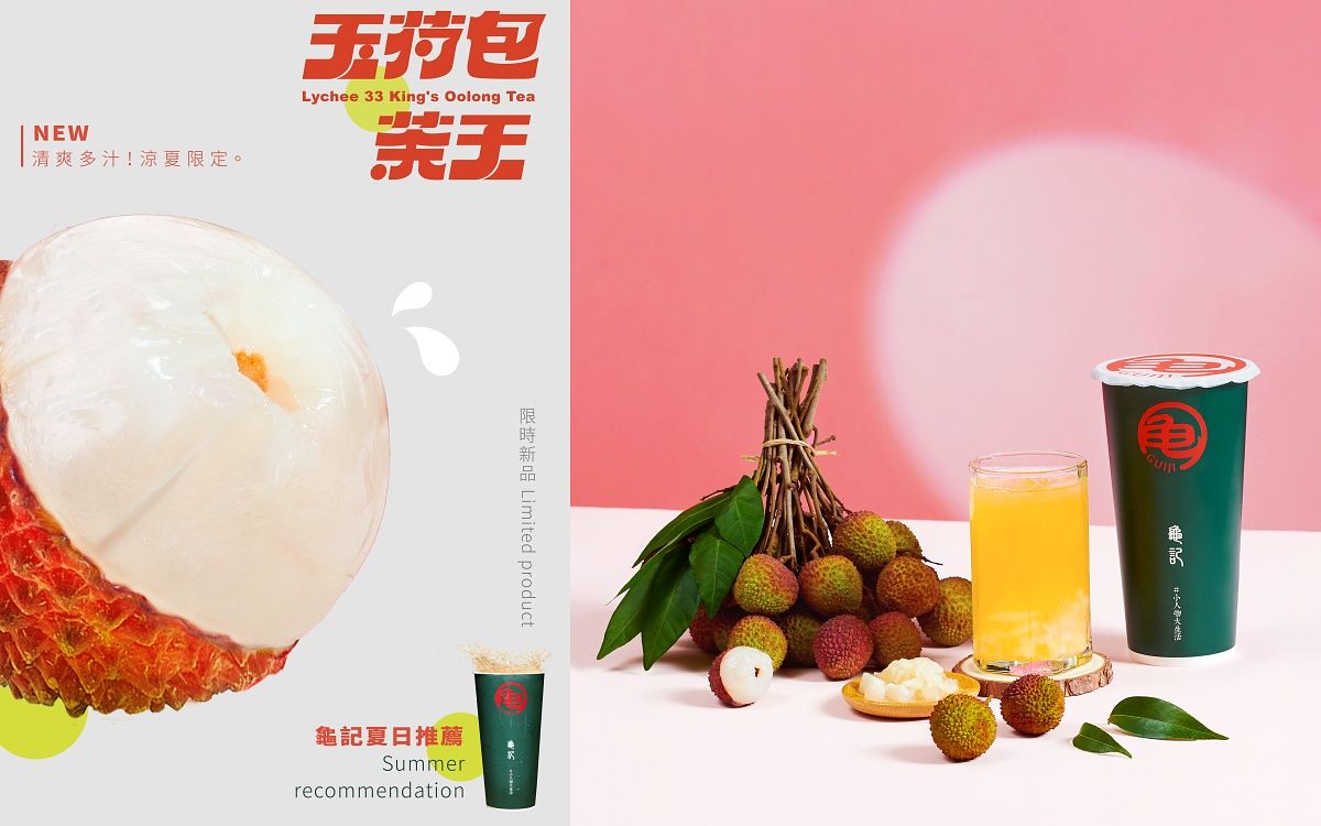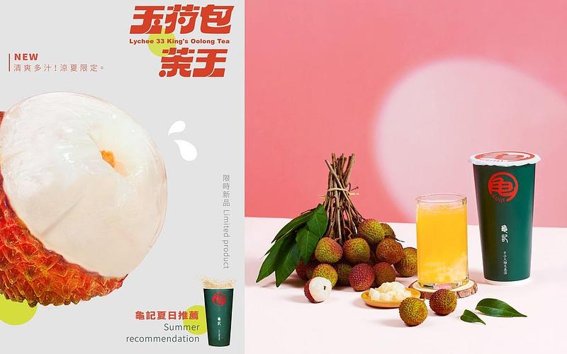 今年夏天龜記推出「玉荷包茶王」 ,嚴選自高雄大樹的玉荷包,完熟果實香氣十足、色澤光亮,雪白肉厚、飽滿又多汁,搭配三晝夜反覆焙火及回火,熟成靜置三十天成就出的三十三茶王,喝來香氣濃郁、餘韻層次。