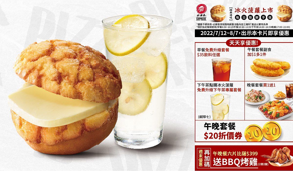 必勝客位於板橋車站內的EXPRESS概念店,鎖定通勤族快速取、方便吃的需求,提供「單片比薩」、「義大利麵」、「燴飯」等多樣化又快速的美食,這次帶來全新的美味驚喜:將最有代表性的港式點心「冰火菠蘿」獻給所有通勤的饕客,成為全台唯一提供道地港味「冰火菠蘿」的速食店!必勝客EXPRESS板橋車站店同時也是全台第一間供應早餐的必勝客,這次也加碼將早餐漢堡系列全面升級為「菠蘿堡」,搭配豐盛多樣化的食材,鹹甜交織的完美口感,再喝上一杯Pizza Hut EXPRESS獨家販售,沁涼消暑的正宗港味「鹹檸七」,不用請假、不用千辛萬苦搭飛機,也能用舌尖暢遊香港!