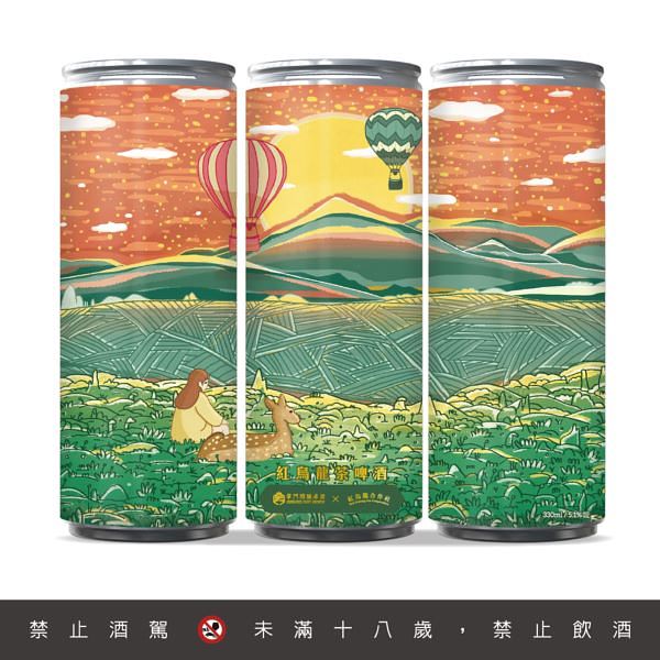 紅烏龍茶啤酒的包裝設計以台東鹿野高台為主題,採用全手繪的景色帶出輕鬆愜意的氛圍,酒標中的人與梅花鹿一同坐在草地上,遠眺緩緩落下的夕陽及飛行在空中的熱氣球,不但呼應了鹿野當地的特色,更象徵大自然與當地人和諧共處的文化。而酒標的主色調選用橘色系,正是因爲紅烏龍獨特的橙紅色茶湯,用以加深整體的記憶點。「紅烏龍茶啤酒」即日起上市,價格依官方為主,售完為止。