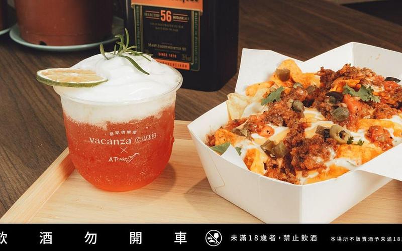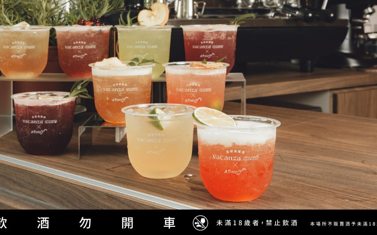 vacanza首度與有「微醺列車」之稱的A Train合作,菜單上的編號從一到七的七種聯名調酒映照出對於不同假期的想像,以不同的調酒交織出專屬自己的微醺假期感,讓你感受到微酸微甜的假期幸福感,享受街頭飲酒的創新體驗和放鬆感。vacanza club同名聯名款以柑橘酒做為基底,再搭配蘇打水,加入酸甜百香果與檸檬泡沫增添口感,整體呈現淡粉橘色的少女般氣泡調酒,等待每一個想淺嚐微醺感、平常卻又沒有飲酒習慣的女孩們。此外,「假期俱樂部vacanza club」同樣推出無酒精的咖啡氣泡飲品,嘴饞時也可以品嚐玉米脆片和爐烤豬腳等下酒小食,滿足所有人對完美假期的想像。