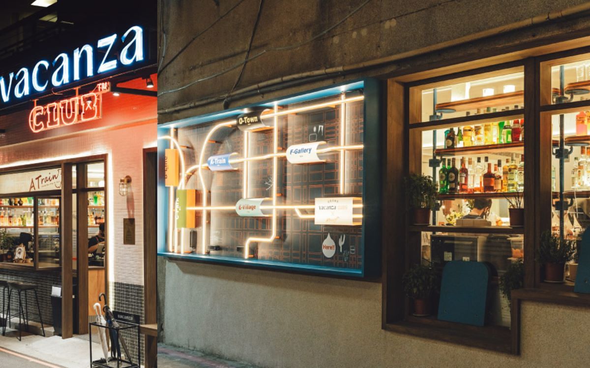 天色漸暗,華燈初上,由藏青色和橘色交織而成的vacanza club霓虹燈招牌在夜色下閃耀,展現紐約街頭般的復古氛圍,「假期俱樂部vacanza club」以帶給每個人心之所向、身之所往的微醺假期感作為核心意象,玻璃貼上的「The heart of freedom leads to vacanza」加上仙人掌和乾杯等圖像,象徵「假期俱樂部vacanza club」期望成為都市中可以跳脫煩惱的城市綠洲。而店外的火車路線圖設計,則以紐約地鐵風記錄「A Train」這台列車目前行駛過的五家酒吧,「假期俱樂部vacanza club」正是第六個行駛之處。