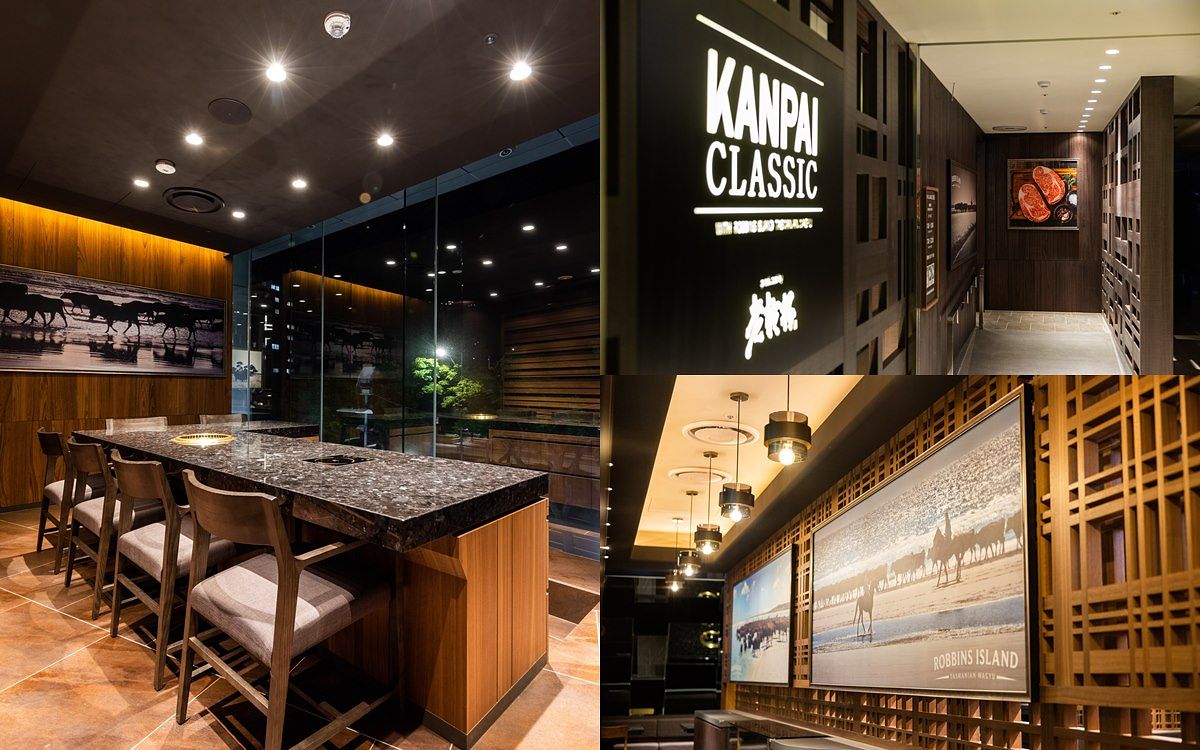首家KANPAI CLASSIC - 全球獨一無二「ROBBINS ISLAND澳洲和牛燒肉專門店」,坐落於新光三越天母店二館2樓,消費方式以單點型態,另收取一成服務費,客單價約為2,000元。KANPAI CLASSIC專用「ROBBINS ISLAND BMS 9+等級澳洲和牛」,來自被譽為「純淨之島」的塔斯馬尼亞周邊海域,一座無人小島ROBBINS ISLAND,有別於一般澳洲和牛僅50%黑毛和牛血統,擁有F4至純血黑毛和牛的基因,在被擁有世界最純淨空氣的大自然環境中,滋育飼養35~36個月以上,多為外銷到世界各國名廚餐廳的頂級名物,可謂世界最珍貴的和牛之一。在日本和牛受限進口30個月齡以下的台灣市場中更是饕客朝思暮想的美味。乾杯集團董事長平出莊司表示:「BMS 9+等級每月平均產量約40至50頭牛,僅約1~2間店鋪的使用量」。