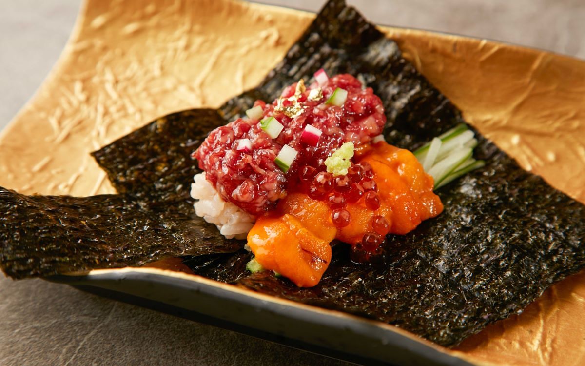 和牛手卷壽司系列以頂級海陸雙享為料理概念,主推「北海道海膽手卷」以清爽軟嫩的和牛生牛肉搭配海味十足的北海道海膽與鮭魚卵,加入黃瓜、櫻桃蘿蔔增添口感,香脆海苔與壽司米飯將食材包覆捲起,品嚐海陸鮮甜交織的豐盛滋味,售價380元/份。另還有生牛肉搭配炙燒鰻魚、北海道生干貝、新鮮蟹肉、義大利魚子醬4款頂級海鮮,共5種奢華海陸風味