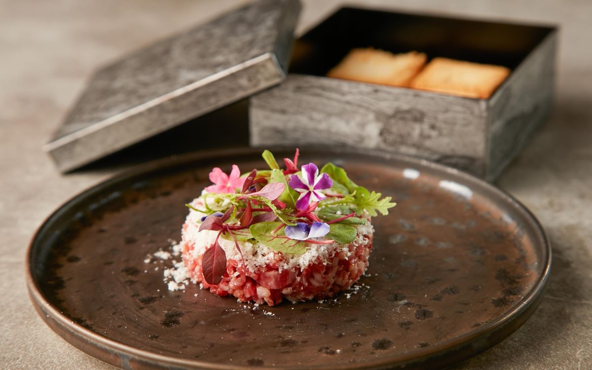 「經典和牛韃靼」與「義式薄片生和牛」為KANPAI CLASSIC色彩繽紛的驚喜料理,不但美味十足,且十分適合多人分食享用。「經典和牛韃靼」以特製調味的生牛肉與帕瑪森均勻攪拌,配上烘烤酥脆、散發著奶油香氣的塊狀吐司享用,富層次的清爽口感,非常適合作為開胃菜搭配餐前酒享用,售價380元;每日限量的「義式薄片生和牛」以薄切和牛生牛肉片淋上松露醬汁,搭配芝麻葉、酸豆、食用花等各式食材,撒上帕馬森起司,呈現出如畫一般的視覺料理,散發出松露獨有香氣,售價480元。