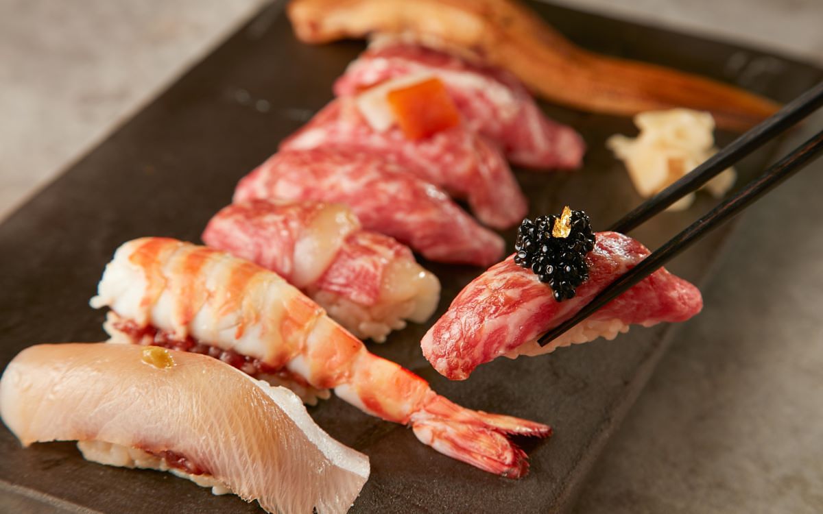 和牛江戶前壽司系列必點「和牛握壽司盛合(8貫)」一次嚐遍所有口味,由職人手切出的薄片和牛後腹肉,可品嚐到和牛原味與搭配台灣產烏魚子、炙燒星鰻、北海道生干貝、鹿兒島青甘魚、西班牙5F品牌伊比利豬、車海老、義大利魚子醬7款頂級食材,並選用來自日本著名的秋田縣產「秋田小町」壽司米製成的握壽司美味組合,每一口都是料理長精心搭配出的珍饈美味,近88折優惠價960元。