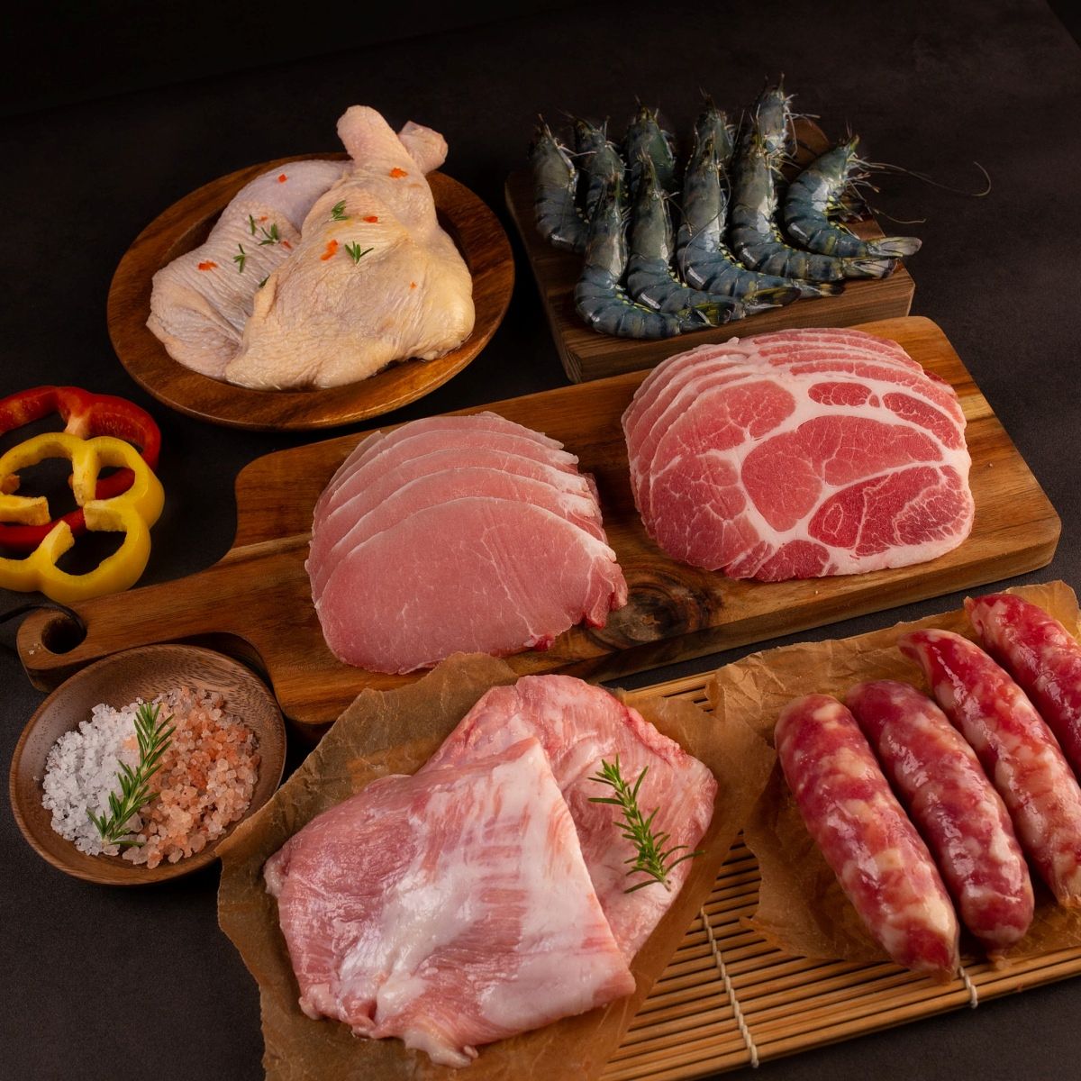 精選由肉品批發第三代所創立的品牌「初喜肉屋」,選用台灣冠軍牧場-暉煌牧場的優質豬肉,肉質穩定、肥瘦比例佳,所推出的豪華綜合燒肉組,除梅花燒肉片、雪花松板豬,更有雞腿排與深海草蝦,一次享有海陸雙重美味。
