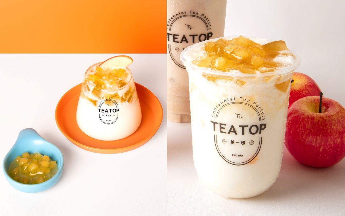 TEA TOP使用台東初鹿小農鮮奶,自製濃郁酸奶,加入新鮮清脆的「富士蘋果」蘋果丁及口感Q滑的茶凍,香濃滑Q、鮮脆多層次,口口都能吃到香甜蘋果。
