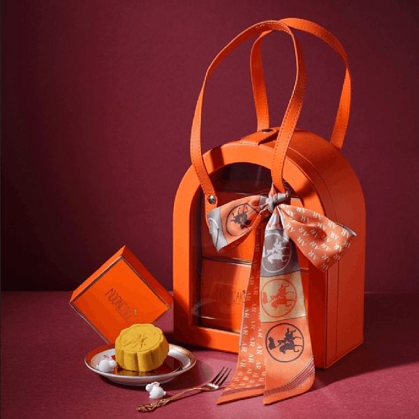 法布甜推出時尚感十足的精品提包和質感絲巾,高貴氣派外觀絕對是送禮首選!內含四入「頂級奶皇月餅」,承用法國工藝研發出低糖、低油和一餅三吃的三大特色,常溫時能吃到內餡鬆軟綿密的口感、低溫時能吃到微微冰淇淋的冰沙感,而微波時流心的鹹蛋黃滑順好入口,再搭配上一杯咖啡或茶,更顯相得益彰。