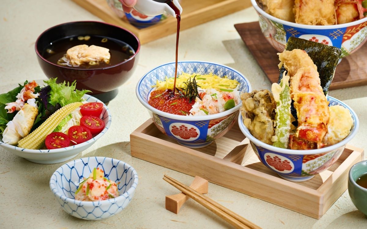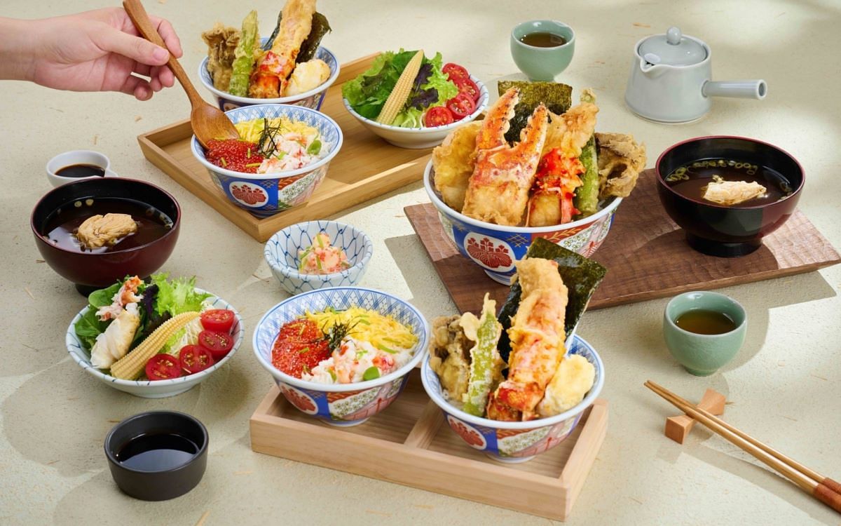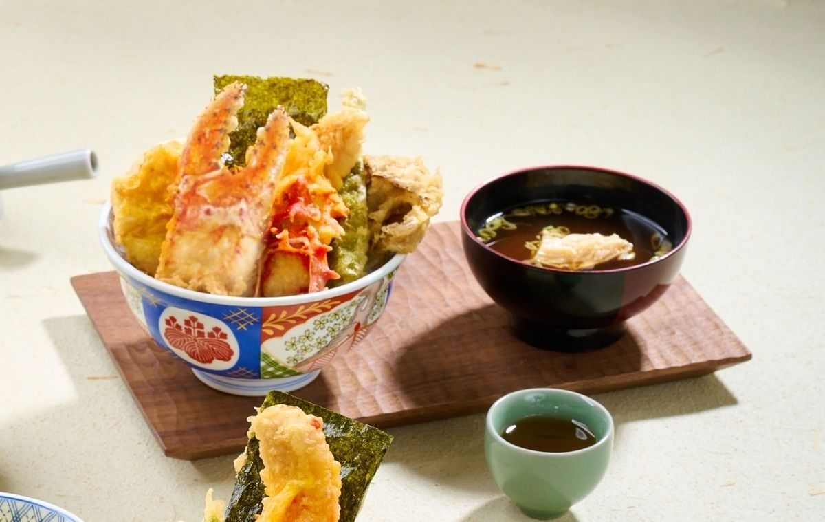 另想純粹品嚐帝王蟹天婦羅,也可選擇華麗版的『帝王蟹天丼』一口嚐盡金黃香酥的甘甜帝王蟹精華,二品帝王蟹味噌湯的鮮美濃郁。天婦羅酥炸麻油的金黃麵衣,包覆著肉質軟嫩酥香的帝王蟹天婦羅,淋上濃郁特殊祕傳的天婦羅醬汁,美味隨口感層次遞進,搭配米飯、半熟玉子一同食用,增加滑潤口感,讓您一次體驗色、香、味豐足。會員嚐鮮價$1,049/套 (原價$1,249)。新光A8店,微風北車店,台南南紡店都品嚐的到。