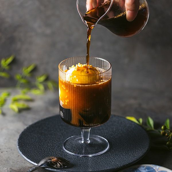 「京町 山本屋」為喜歡咖啡的老饕特別挑選「哥倫比亞」深焙咖啡,蘊含著熟果甜醇且濃郁醉人酒香。珈琲阿芙佳朵以咖啡凍為底,放上香草冰淇淋、京都鹹味米果,最後再淋上「哥倫比亞」深焙咖啡。咖啡與冰淇淋的苦甜碰撞交錯,味道看似矛盾,嚐一口卻又讓人難以抗拒。