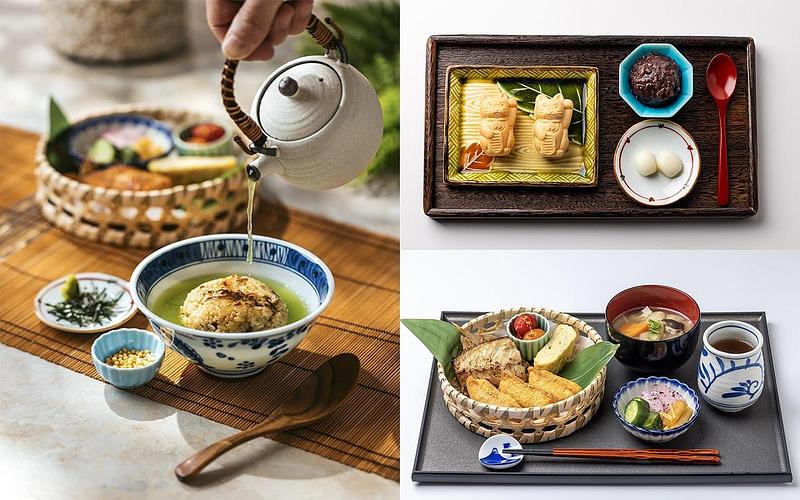 以「京町 山本屋」特調醬汁調製出美味烤飯糰,放入碗中後並佐以些許昆布佃煮、京都米果、山葵、海苔絲,再淋上抹茶玄米茶或焙茶為湯底,飯粒吸飽茶香,配料豐富了口感。主菜則為每週西京燒(鮭魚、鯖魚、豬、雞,店家任選一款),吃在嘴裡可感受到主廚特調京都風白味噌的甘甜味,滋味高雅!搭配小菜(店家依當日菜色任選三款:玉子燒、桂花小番茄、金平牛蒡、山椒小魚、西京味增奶油起司、京都芝麻豆腐等)及自家醃漬物(店家依當日菜色任選三款:鹽麴小黃瓜、醬汁老薑大根、醃季節野菜、紫蘇大根等),京都食趣十足雅致。茶泡飯的茶香和烤飯糰美味相互輝映,吃一口讓人一秒到日本。