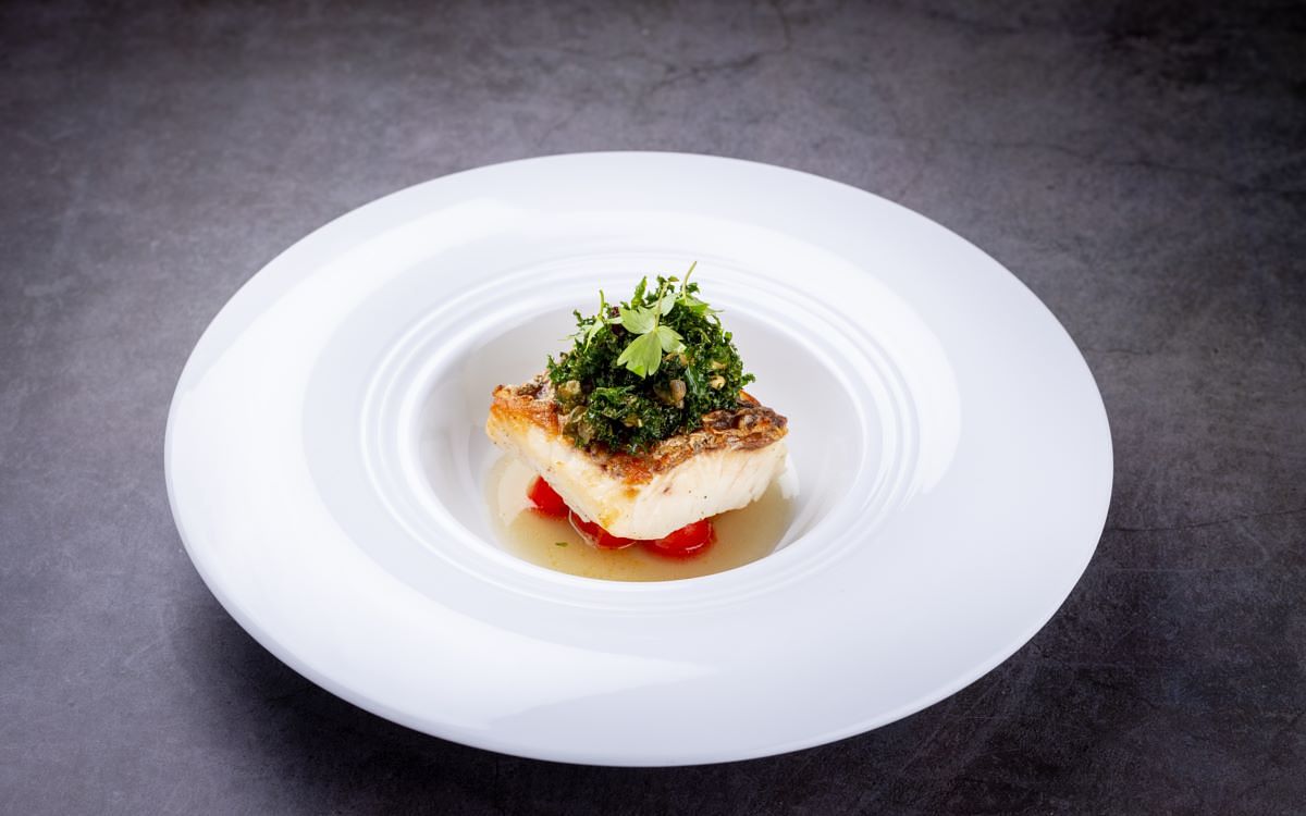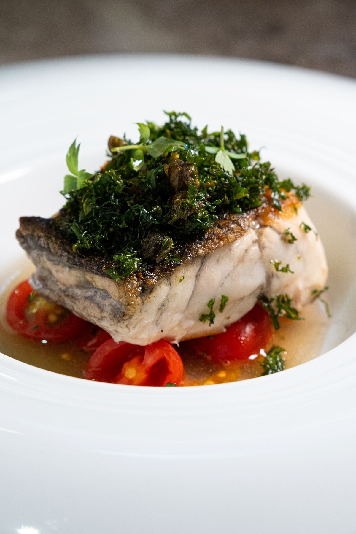 嚴選臺灣西海岸5公斤以上海鱸魚,先將鱸魚表皮煎至酥脆,搭配酸豆熬煮高湯增加整道料理的風味,底部鋪墊以鹽、橄欖油醃漬帶些許酸甜感的小番茄,最後將帶酥脆口感的炸羽衣甘藍、炸酸豆、松子與葡萄乾鋪至鱸魚上層,不僅將口感層層堆疊也讓整道料理宛如精緻藝術品般。