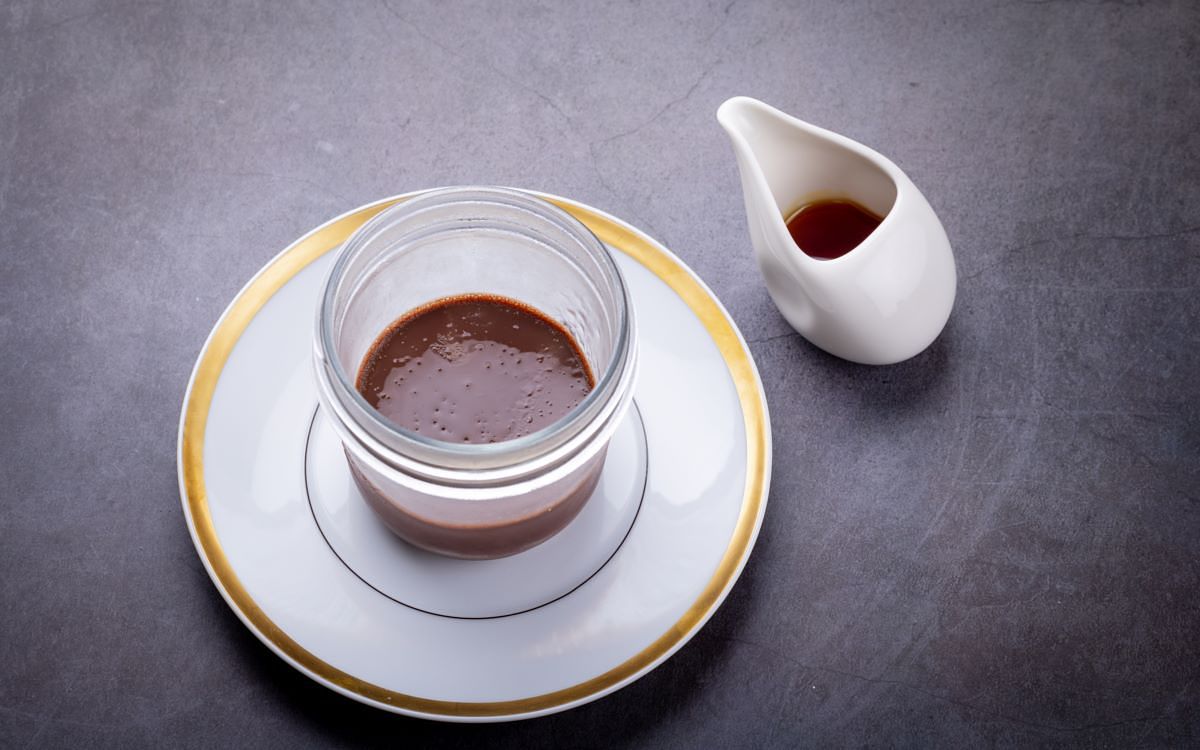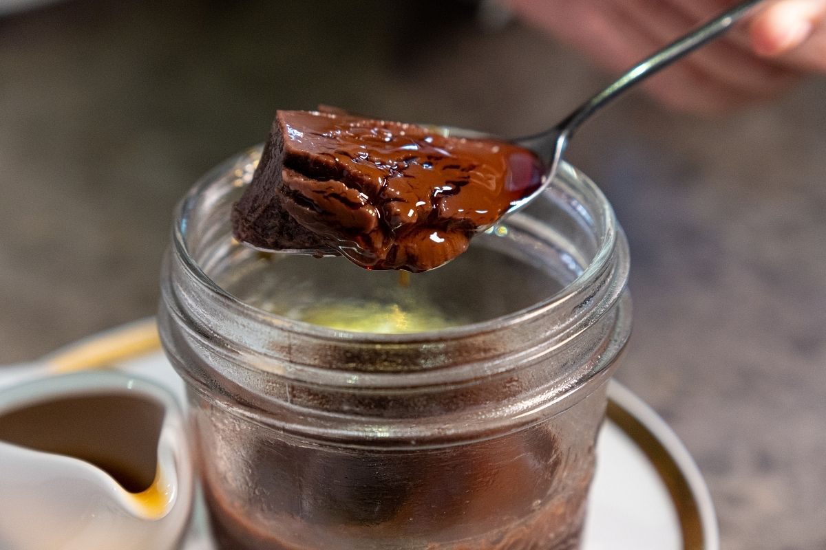 布丁體以牛奶、蛋、可可粉、杏仁餅粉與杏仁酒均勻混合後再做蒸烤,屬於皮埃蒙特的特色甜點之一,口感介於蛋糕及綿密布丁之間,可搭配淋上威士忌糖漿,微苦的焦糖巧妙的平衡了甜度,每一口都能嚐到濃厚的可可與杏仁香氣。