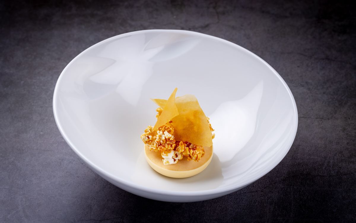 將玉米以三種不同方式呈現,底部冰糕是以新鮮玉米製成,搭配焦糖海鹽的爆米花以及玉米脆片,從片、粒到糕狀呈現出令人驚豔的口感清甜風味。