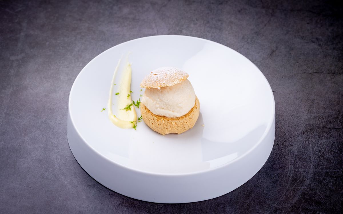 將台灣常見的古早冬瓜檸檬幻化成為精緻甜點,自製脆皮泡芙夾檸檬冬瓜冰淇淋,底部搭配冬瓜茶濃縮糖漿及檸檬醬,酸甜輕盈的口感,讓味蕾清爽無負擔。