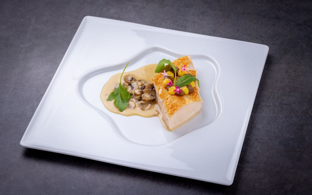 特選台灣在地玉米雞,將雞肉舒肥並沾上帕瑪起司麵包粉後香煎上色。上方搭配香菇醬、玉米卡士達醬,最後佐以白酒、褐色雞高湯與蘑菇所慢熬的醬汁,蕈菇濃郁香氣搭配酥脆多汁的玉米雞一同享用,彷彿在味蕾間譜成一道令人心曠神怡的美食交響曲。
