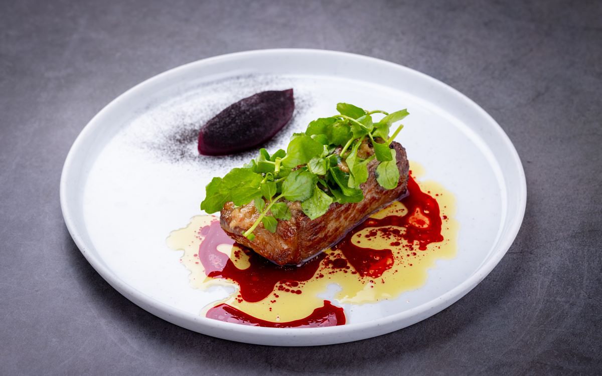 將新鮮翠綠的嫩綠蘆筍以板煎的方式保有其原味及爽脆口感,上方搭配以焦化奶油、榛果、鼠尾草熬煮的醬汁所煎的香酥半熟鴨蛋,最後以滿滿鮭魚卵做點綴,整體風味濃郁十足,美好滋味難以忘懷。