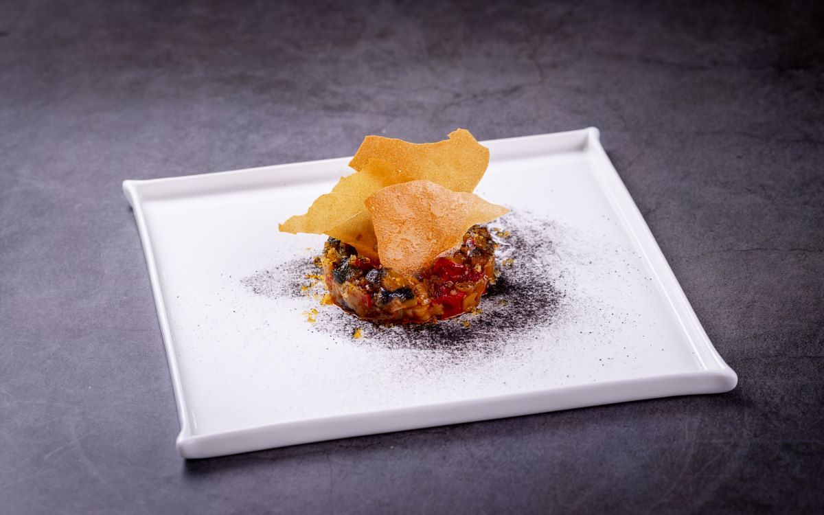 Caponata是經典的義大利西西里島燉菜料理,此次團隊以創新手法賦予其新樣貌。燉煮松子、茄子、甜椒、櫛瓜等蔬食,佐以醃漬風乾後的蛋黃醬,再刨上醃漬風乾後的蛋黃提味,以黃芥末與馬鈴薯所製的薄片帶有淡淡高雅的苦味,最後撒上散發濃郁香甜的焦化洋蔥粉,讓整道料理達到完美的平衡。