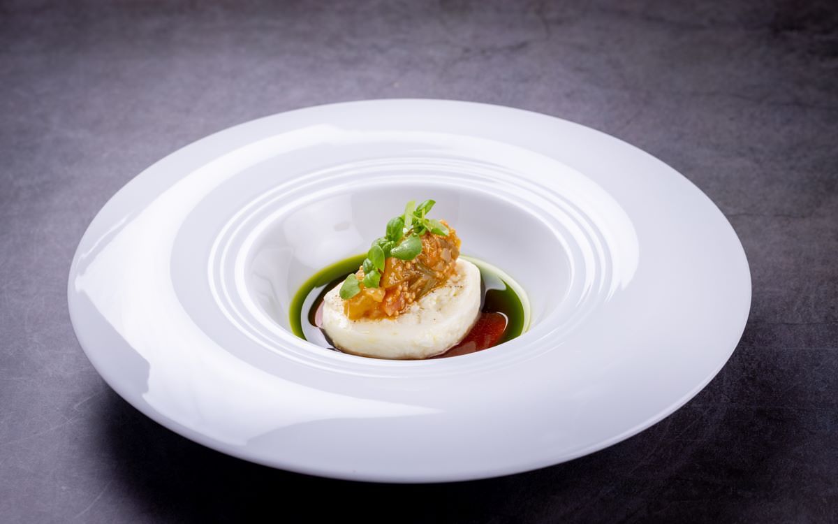 團隊特別將傳統的布拉塔料理以兩種不同的番茄呈現出不同層次風味,底部清湯選用新鮮聖女番茄所熬製,可以品嚐出番茄原味的清甜,最上方選用綠番茄做成令人難以忘懷的酸甜醬,入口層次豐富卻十分爽口輕盈。