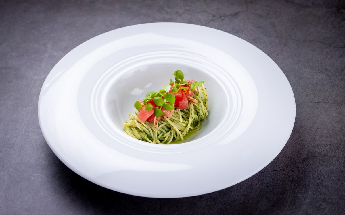 義大利冷麵為台灣較少見的料理,團隊將冷麵拌入用紫蘇做成的青醬,搭配以柚子橄欖油與白醬油提味所製成的鮪魚塔塔醬,最後撒上烘烤過的櫻花蝦,清爽又香氣十足,最適合炎熱夏季!