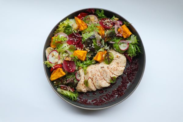 舒肥雞胸肉對於健身、重訓者來說是最完美的營養補給,不僅低熱量、低脂肪,還擁有高蛋白質!勺日舒肥雞烤瓜瓜沙拉,運用了大量生菜、南瓜、地瓜等含有高營養密度、低熱量,又同時具有飽足感的食材組成,在減肥時能很適合做為主食的完美替代!