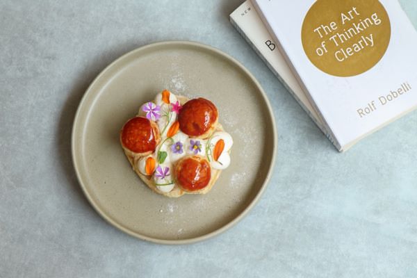 以知名法式甜點聖多諾黑為靈感,延伸出的變奏版本甜點,勺日咖啡別出心裁將底部改為可頌鬆餅,放上焦糖小泡芙加以烘烤,甜點中央擠上香草卡士達醬,擔任融合口感的重要角色,最後淋上萊姆酒增加風味與香氣,一口咬下在口中綻放出多層次香味與口感,輕灑花朵點綴於上方營造出小花園意象,口味和顏值都超高,無法出國也能享受法式下午茶氛圍!