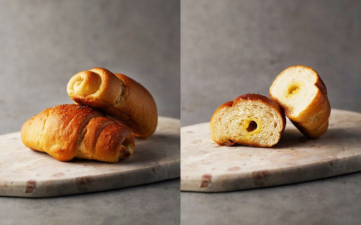 將於 10/7 上市的明星產品,歷經數月研發,延續日本 SAKImoto 的正宗配方,產出兩款奶油捲:鹽之花與黑松露。兩款奶油捲皆以日本嵜本麵粉及歐盟 AOP 產區認證、享有「奶油界LV」盛譽的法國艾許無鹽奶油製成,結合直接製法與湯種製法,口感上外酥內軟。鹽之花奶油捲混合了百花蜜與比利時無鹽發酵奶油,入口時,先感受到清甜的蜂蜜香氣,柔韌有嚼勁的麵包口感,並加上法國布列塔尼海岸知名的頂級海鹽 — 鹽之花,以人工採集的鹽之花,因成本高、產量少而顯得特別珍貴,溫和帶出高雅鹹香並融合奶油的醇厚濃郁,是吃了會忍不住上癮的款式。黑松露奶油捲則是加入有黑鑽石美稱的義大利黑蘑菇松露醬及夏威夷黑鹽,撲鼻便聞得到黑松露高雅的香氣,加上夏威夷黑鹽,不僅讓黑松露的香顯得層次更為豐富,口感上也保有鹽之花奶油捲的柔韌口感,在一捲一捲中,體會最高貴的享受。