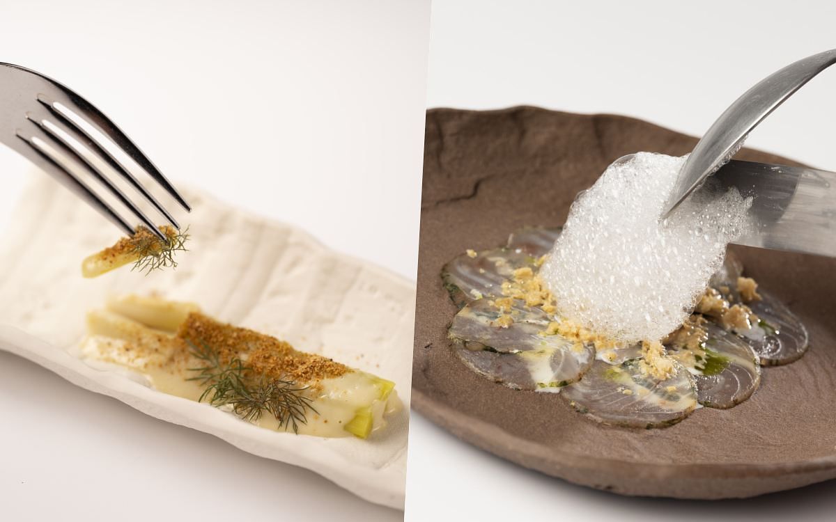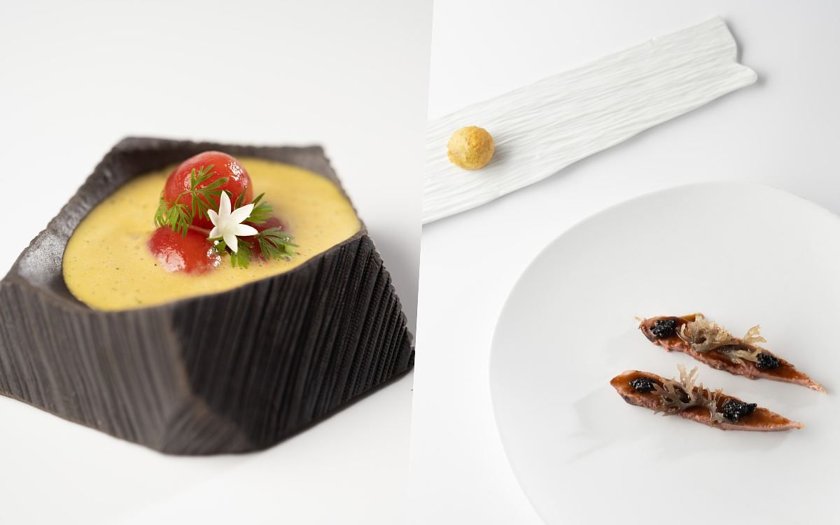 Molino de Urdániz本季著重於西式料理手法重新詮釋台灣在地食材的美味,搭配秋季醃製料理為題材,更首度與台灣工藝「千秋陶坊」合作,純手工客製化打造專屬於渥達尼斯磨坊的食器,每個器皿都有自己獨特的表情,更與每道料理的內涵相呼應。初登場的「驕陽」以龍蒿醋淹漬的玉女番茄入菜,如同照耀山谷的豔陽,為嚴峻的山峰染上一抹金光,更彷彿比擬著西班牙本店於群山環抱的渥達尼斯小鎮,以鱒魚卵泥為主軸的伯那西醬和龍蒿油融合,伴隨極具線條感的面切岩石盤,高溫還原燒出土中含自然礦物所表現的黑彩,呈現一種內柔外剛的新風貌。「蔥容」則使用台灣在地韭蔥為主體,無韭菜的刺鼻,亦無蔥蒜的辛辣,取而代之的是天然的清甜,跳脫台式傳統的作法,米其林主廚以巴斯克區的料理手法展現韭蔥不為人知的從容與優雅,更以台灣植物特有檳榔樹為盛裝設計,取其樹幹為原型,拓印出各種相似卻又相異的容器,翻轉視覺與味覺的台灣韻味。