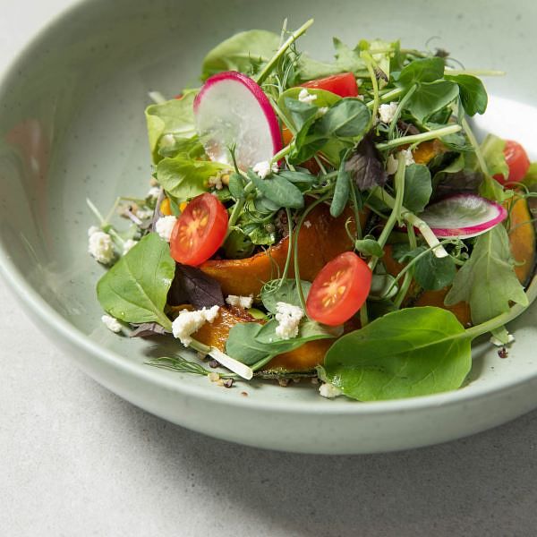 溫暖脾胃,適合秋冬的溫沙拉! 甜滋滋的南瓜淋上蜂蜜烤過, 羽衣甘藍略烤過後,拌入水煮藜麥、毛豆和綜合沙拉,淋上蜂蜜莓果油醋、撒上南瓜子、松子與菲達起司,酸甜鹹香交錯,輕鬆愉悅地享用毫無負擔的沙拉。