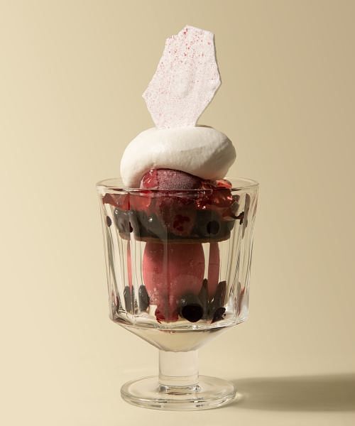 黑醋栗洋梨雪酪、酸櫻桃雪酪、優格冰、黑醋栗櫻桃茶凍、夏日莓果、巧克力酥餅、瑪斯卡邦鮮奶油、莓果蛋白餅