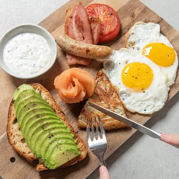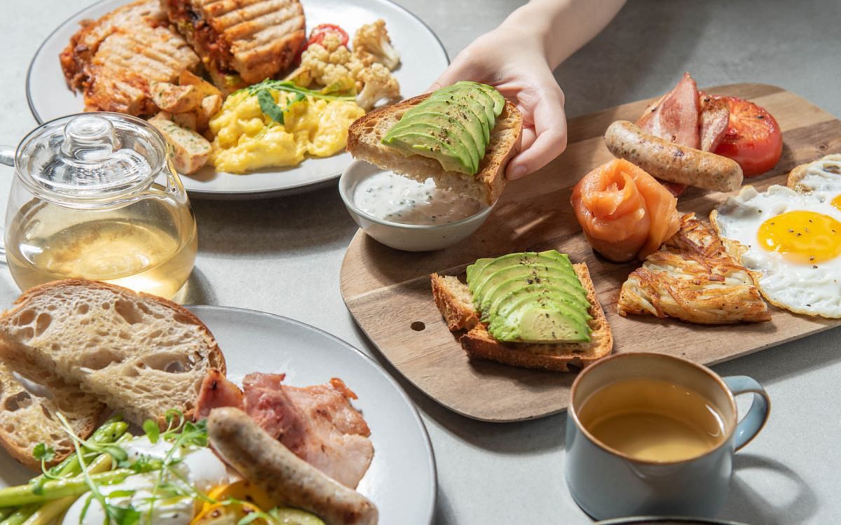 酪梨法式鄉村麵包、燻鮭魚、太陽雙蛋、瑞士馬鈴薯煎餅、厚切培根、德式香腸、酸奶洋蔥醬