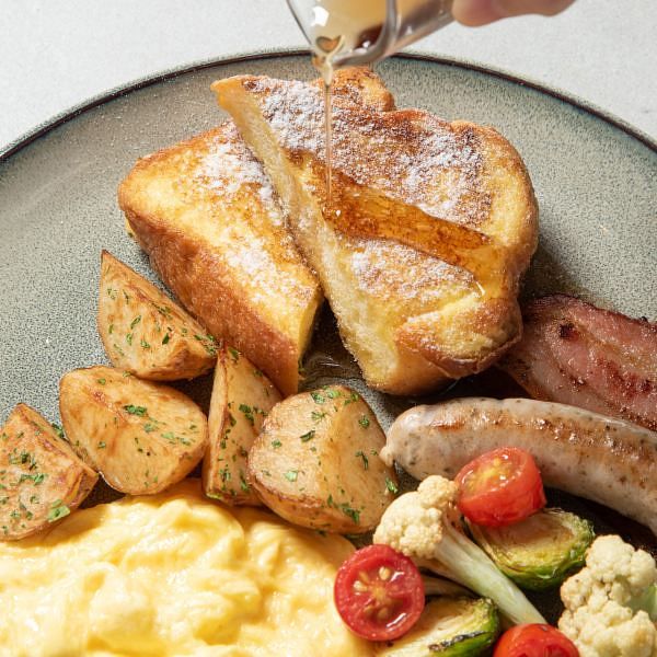 法式炒蛋、厚切培根、德式香腸、烤蔬菜、可頌/布里歐法式吐司佐楓糖漿