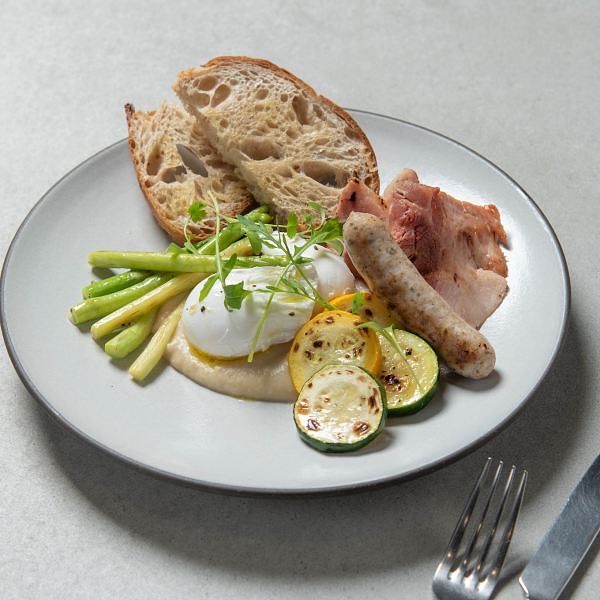 法式鄉村麵包淋上橄欖油烤過增加香氣,搭配油潤鹹香的法國帶皮火腿、德式香腸、烤蔬菜、柔滑綿密的白花椰菜泥,以及吹彈可破的水波蛋。如同崇尚自由的法國的民族性,不拘形式的吃法,可以拿起一片麵包,放上火腿和水波蛋,或者將水波蛋劃破與花椰菜泥一起品嚐,怎麼搭配都美味!