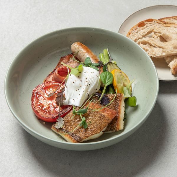 嫩煎肉質厚實的比目魚,搭配有著高營養價值的超級食物羽衣甘藍和藜麥沙拉,爽口的沙拉佐酸甜的蜂蜜莓果油醋,凸顯比目魚的鮮美。豐富的配菜搭配包含:烤蔬菜、德國香腸、厚切培根、Q彈水波蛋和鄉村麵包,豐富的蛋白質和蔬食纖維均衡搭配的一道!