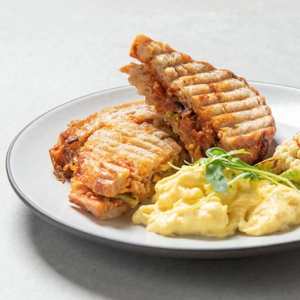 牛五花與多種墨式香料慢慢熬煮出濃郁略帶辣勁的墨西哥辣牛肉醬,主廚特別在肉醬內加入中式醃菜酸豇豆,平衡風味。 麵包夾入辣肉醬和切達、艾曼塔兩種起司,經過熱壓後,滿滿肉醬與起司交融,一口咬下,濃郁的起司辣肉醬緩緩帶出豇豆的獨特酸味,搭配滑嫩的法式炒蛋與烤蔬菜,份量滿足,口口過癮。