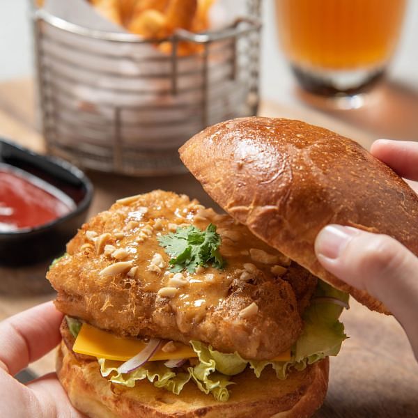 西式漢堡與東方口水雞結合的創意滋味!選用肉質豐厚的雞腿排,特製調配麵衣,經過酥炸後外皮輕盈酥脆、雞肉仍保有多汁鮮嫩的口感。淋上自製的川香胡麻醬、再鋪上脆脆花生粒與香菜,在川味香料與胡麻、花生的堅果香氣相乘下,一舉將香氣和口感層次提高!中西合併的趣味組合,推薦給喜歡與眾不同的饕客。