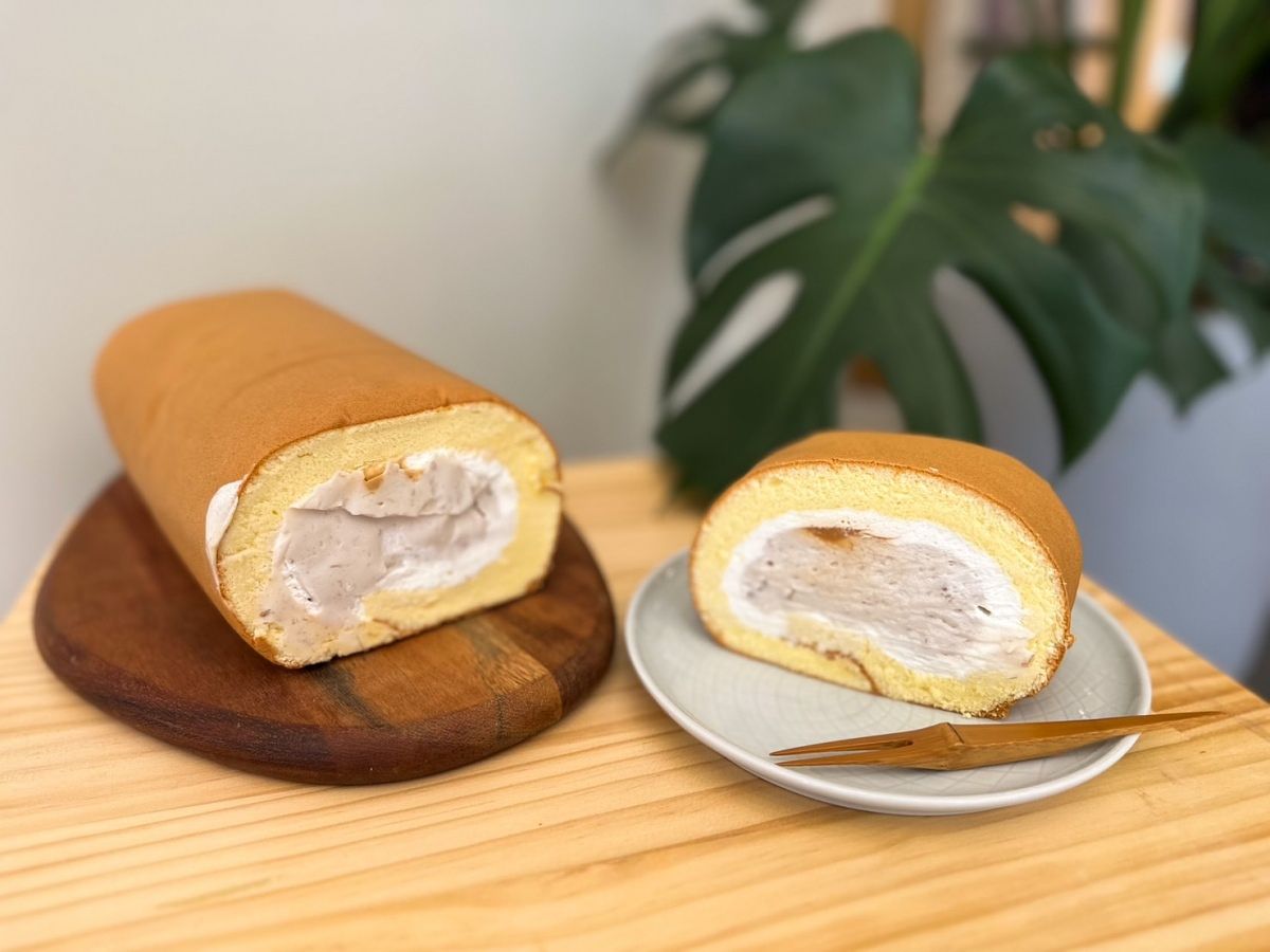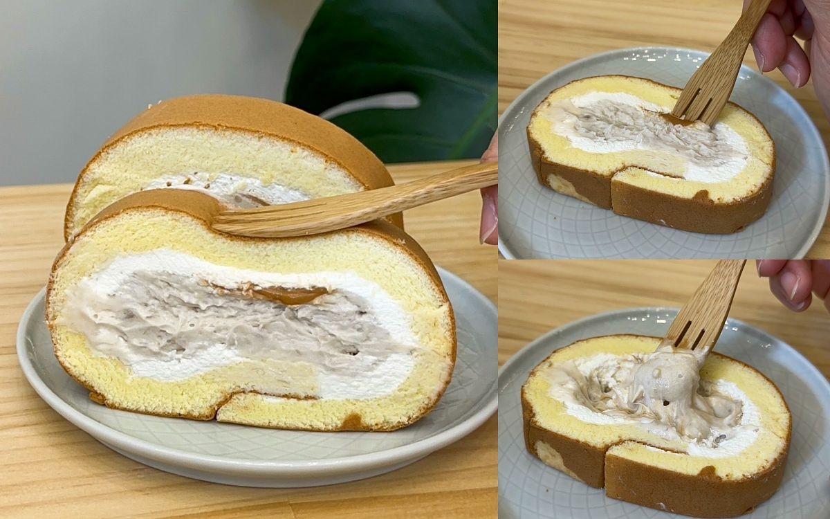 使用與芋頭泡芙同樣的鮮奶芋泥,包覆在蛋香十足的蛋糕卷中,每一口的鮮奶芋泥都能吃到芋頭顆粒塊,最特別的內餡中有少許的特製焦糖海鹽。