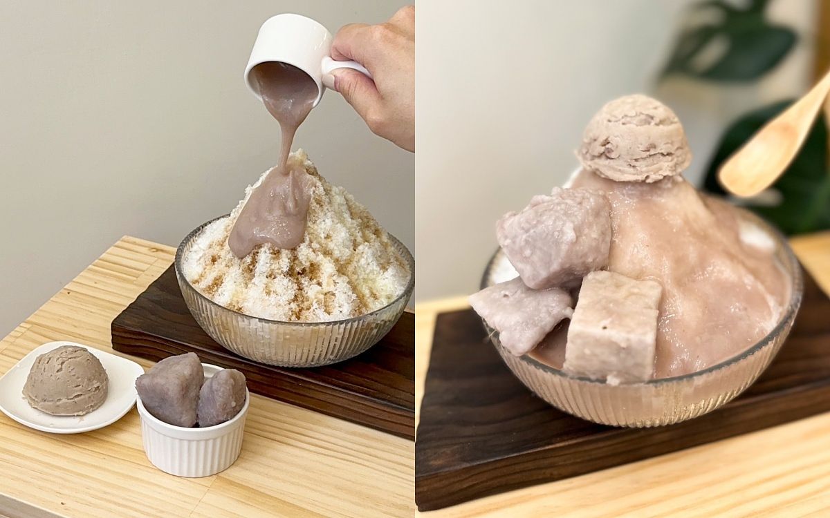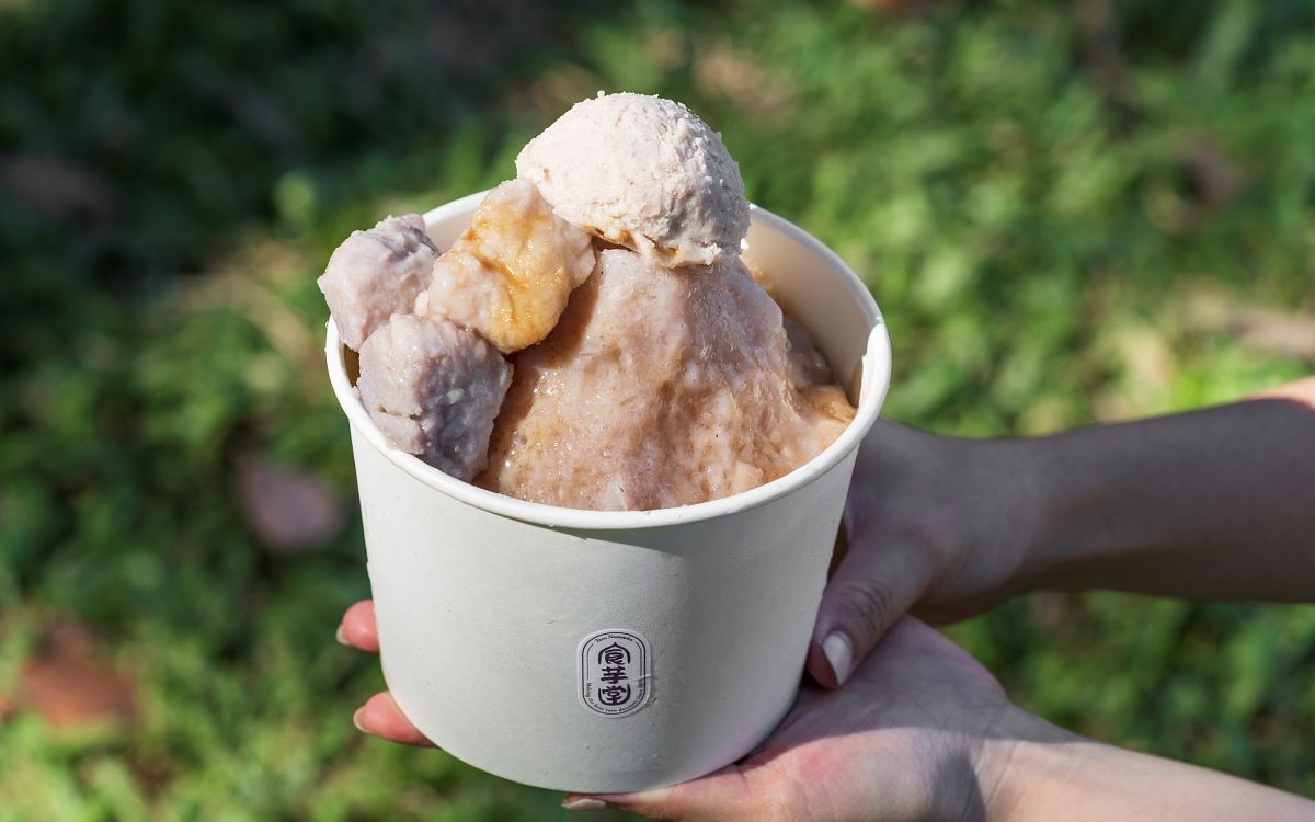 食芋堂首度開賣冰品,也是台中店獨家外帶限定!在現刨的剉冰淋上焦香的古法黑糖蜜與香濃煉乳,外帶盒將芋泥、蜜芋頭與人氣芋泥球分裝,食用前可發揮DIY的樂趣將絲滑的芋泥如瀑布般傾瀉倒下,加上大塊的蜜芋頭,於冰品最上方堆上一整顆芋泥球,打造出極致超奢華的芋頭饗宴!